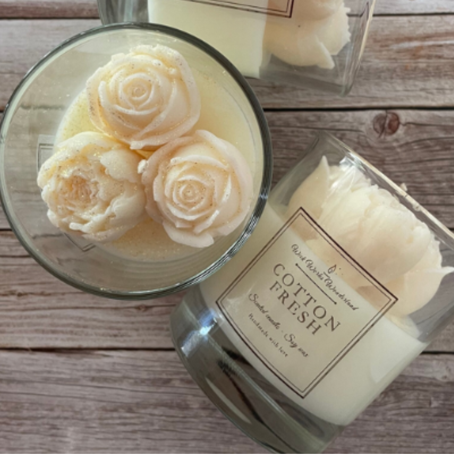 Een handgemaakte geurkaars met een subtiele en frisse geur die doet denken aan schone, gewassen katoen. Deze geur wordt vaak geassocieerd met het gevoel van zuiverheid, comfort en ontspanning welke kan helpen om een rustige en schone sfeer te creëren in je huis.