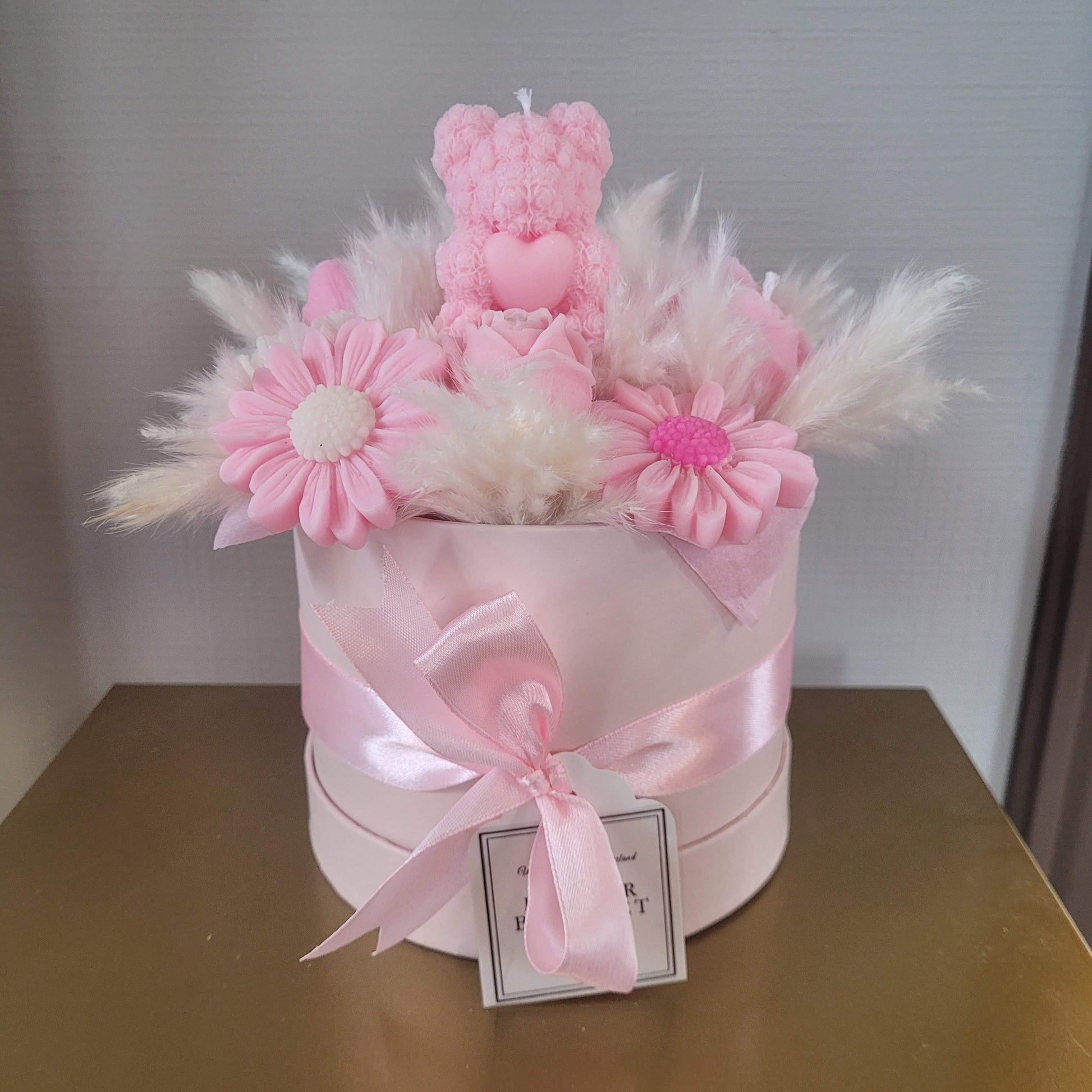 Prachtig handgemaakt kaarsboeket gemaakt met koolzaadwas. Dit boeket zit in een ronde hoedendoos van 16 x 10 cm.